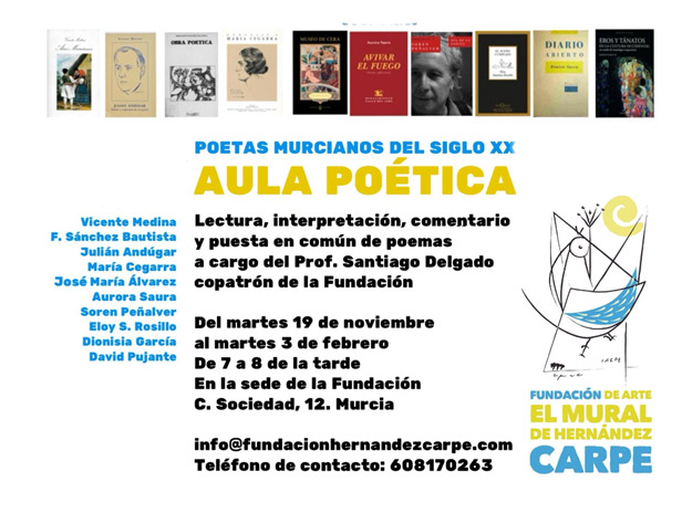 Comenzamos el año dando continuidad a nuestra Aula Poética, dirigida por nuestro patrono Santiago Delgado. A lo largo de varias sesiones semanales se fueron desgranando poesías de poetas murcianos, disfrutadas por oyentes y participantes, entre los cuales tuvimos el honor de recibir a Soren Peñalver.